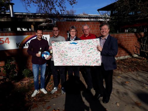 Als Dankeschön hatten die Kinder ein Lied für Mo-Torres geübt und vor der Scheckübergabe mit ihm gesungen. „Liebe Deine Stadt“ klang es durch die Flure der Villa Kunterbunt, Mo-Torres sang die Strophen, die Kinder lautstark den Refrain, begleitet vom Lehrer Adrian Kind an der Gitarre sowie den Kindern an Cajon-Trommeln und an einer besonderen Snare-Trommel.